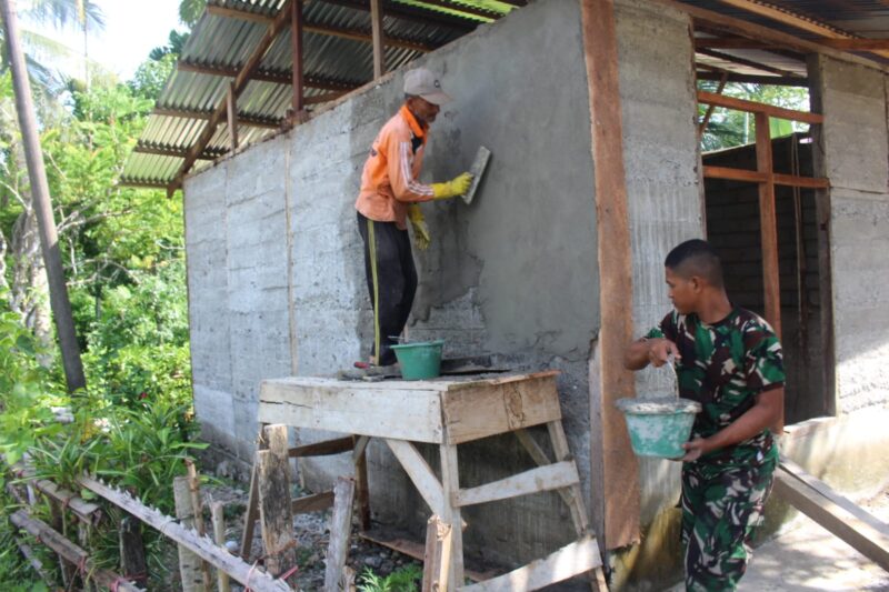 Seperti terlihat pada Rabu (29/4/2026), personel Satgas TMMD bersama warga bahu-membahu melaksanakan pengerjaan perehaban rumah secara gotong royong. Dalam kegiatan tersebut, tampak seorang anggota TNI turut membantu proses pengadukan material, sementara warga melakukan plester dinding bangunan.