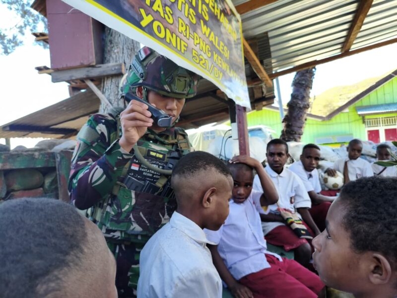 Barbershop Macan Kumbang Gratis Satgas Yonif 521/DY Memberikan pelayanan cukur rambut gratis dengan sentuhan penuh kasih di di Pos Kotis Distrik Walesi, Jayawijaya, Papua Pegunangan. (17/09/2025).
