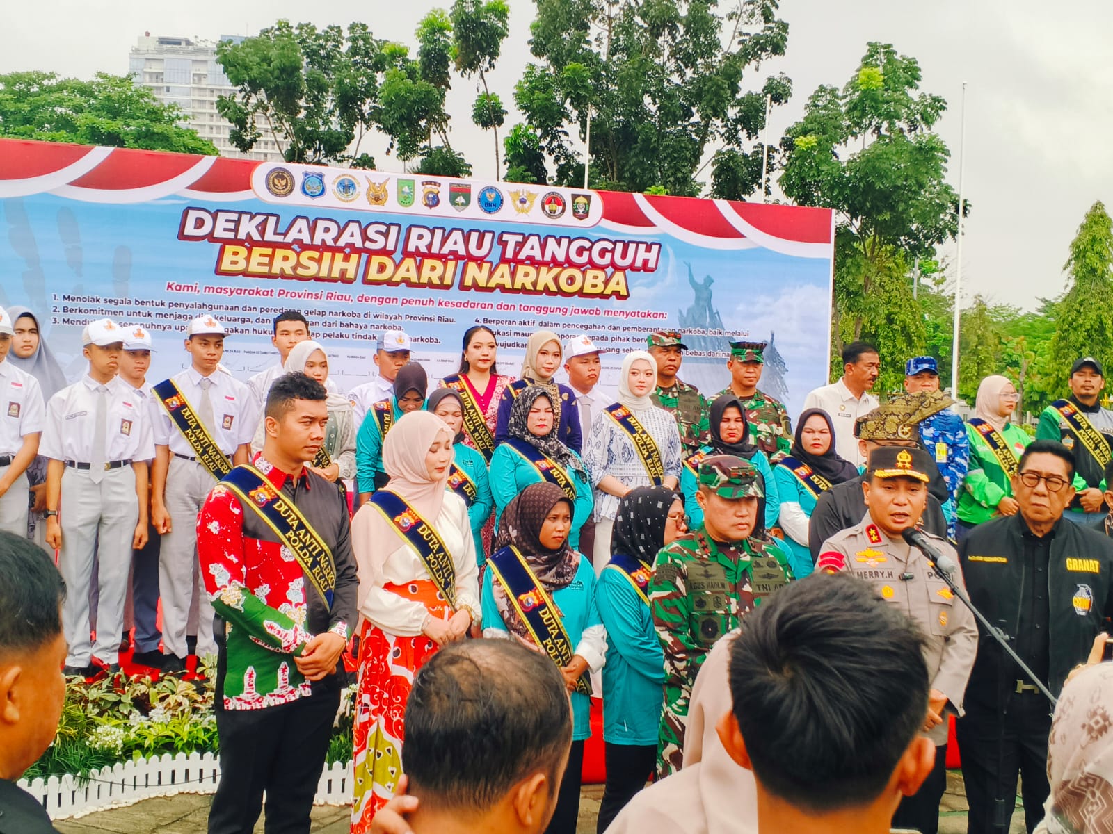 “Semangat ibu-ibu ini luar biasa. Kami angkat mereka jadi Duta Anti Narkoba Riau,” kata Irjen Herry disambut tepuk tangan peserta apel.