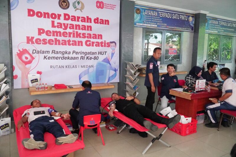 Bertempat di halaman depan Rutan, Usai senam, rangkaian kegiatan berlanjut dengan pelaksanaan donor darah bekerja sama dengan Palang Merah Indonesia (PMI) Kota Medan. Para pegawai dan pengunjung tampak antusias mendonorkan darahnya sebagai wujud nyata kepedulian terhadap sesama yang membutuhkan. Kegiatan ini sekaligus menegaskan bahwa semangat kemerdekaan bukan hanya dirayakan dengan upacara seremonial, melainkan juga dengan aksi nyata yang memberi manfaat luas bagi masyarakat.