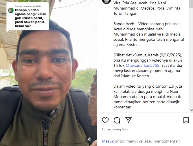 Video berdurasi pendek itu telah ditonton hampir dua juta kali, dan tersebar luas di berbagai platform media sosial. Di dalamnya, pria tersebut secara gamblang menyampaikan argumennya meninggalkan Islam dengan gaya provokatif yang menyentuh simbol-simbol suci dalam Islam, termasuk menyeret nama Nabi Muhammad SAW secara tidak pantas.